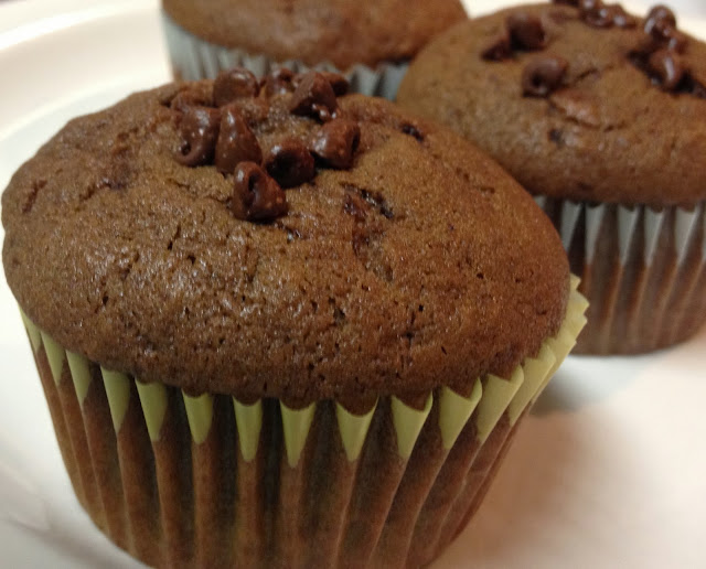 Fill the muffin cups ¾ full and bake for ~22 min or until toothpick inserted in the center comes out clean. If you wish to sprinkle chocolate chips on top, sprinkle them about 15 min after putting the pan into the oven.